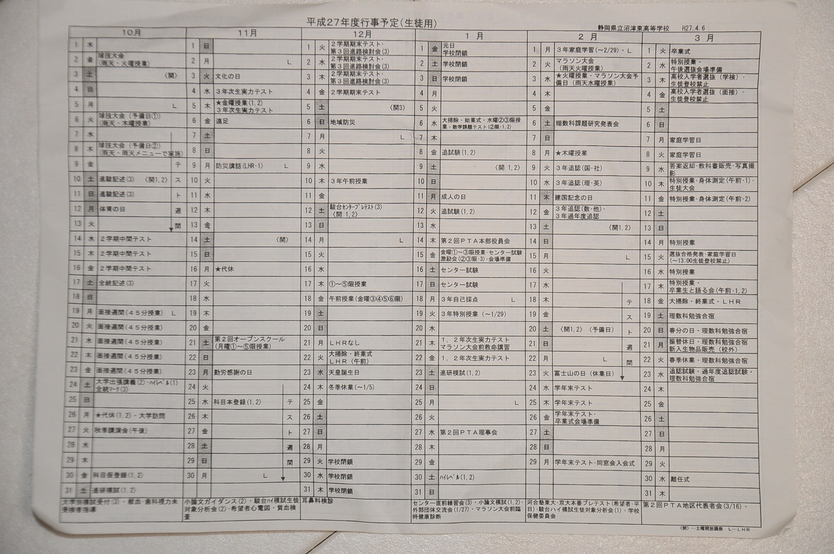 平成27年度学校行事一覧