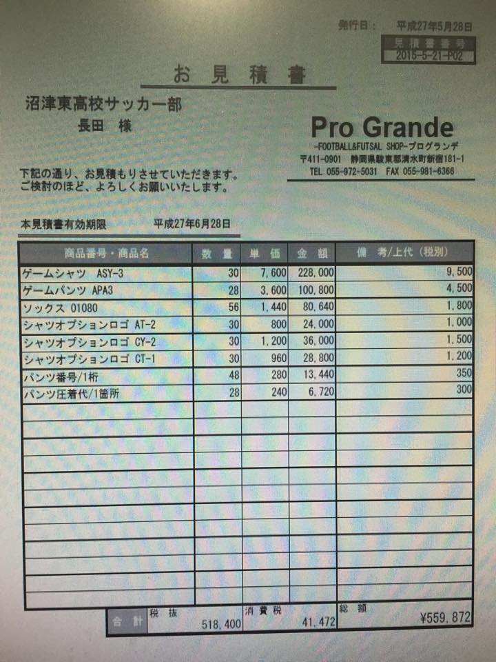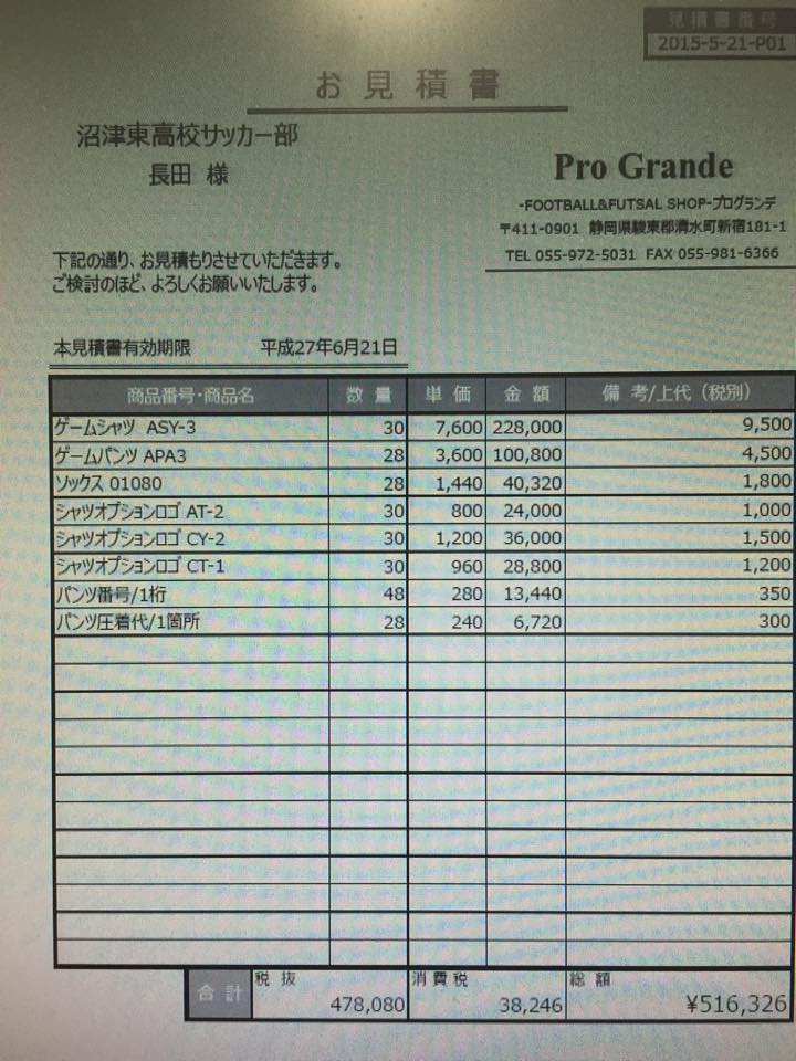 ◆沼東サッカー部OBの手嶋さんがお世話をしてくれるドリブルジャパンで注文をします。私も部員代表者数名に付いていきますのでご安心ください。オーダーユニフォームは、この時期、チームの新設や部活の入替えで込み合いますので、約1.5ヶ月~2ヶ月程掛かります。昨年は、5/2週目に引退して、7/19に完成しました。一昨年は7/14、3年前は7/26に完成しました。今年は早く手をつけていますので、遅くても7/上旬、でもでも・・・手嶋さんに頼み込み、6月下旬に仕上げてもらおうと目論んでいます。