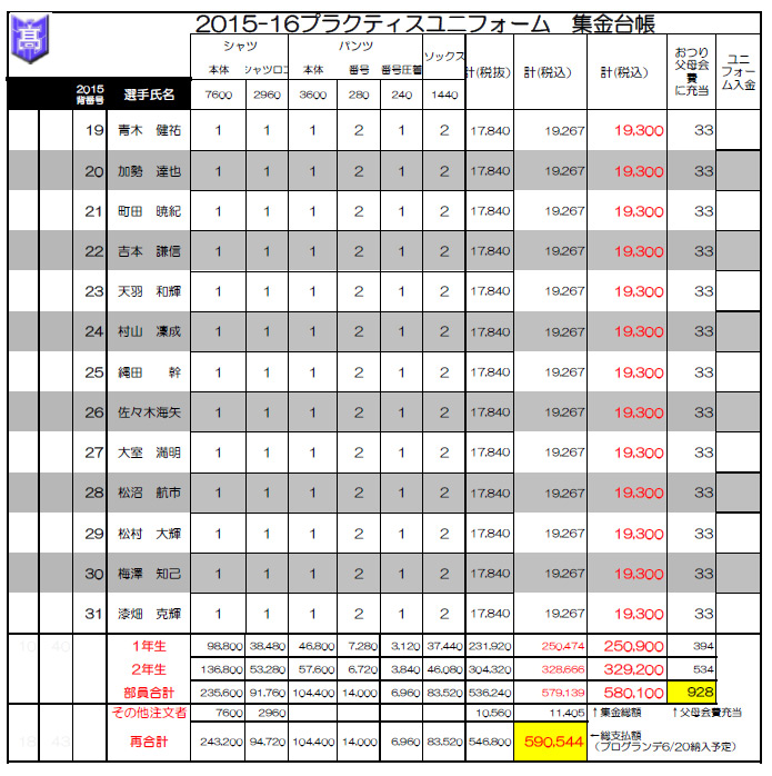 ◆ユニフォームを注文するためには、各人の背番号とサイズが確定していなければなりません。